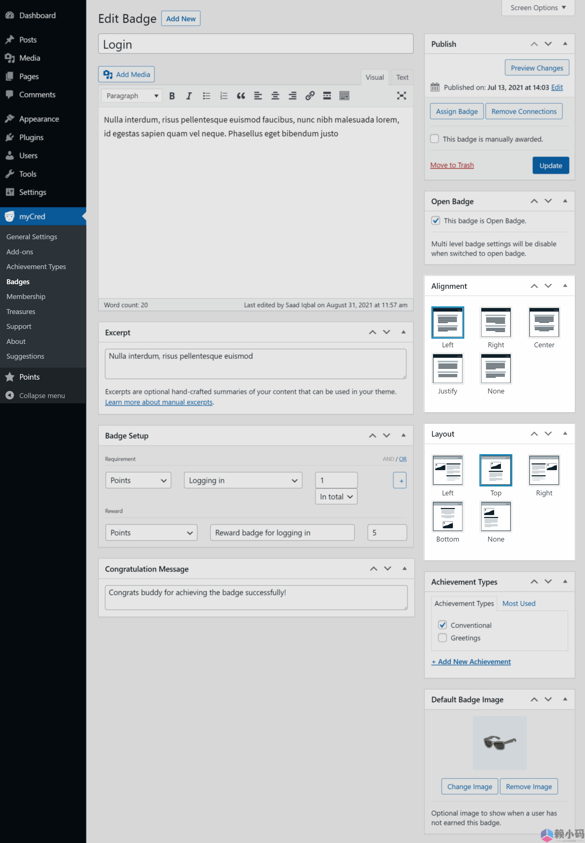 – “快速编辑”徽章选项将允许您修改任何特定徽章的信息。